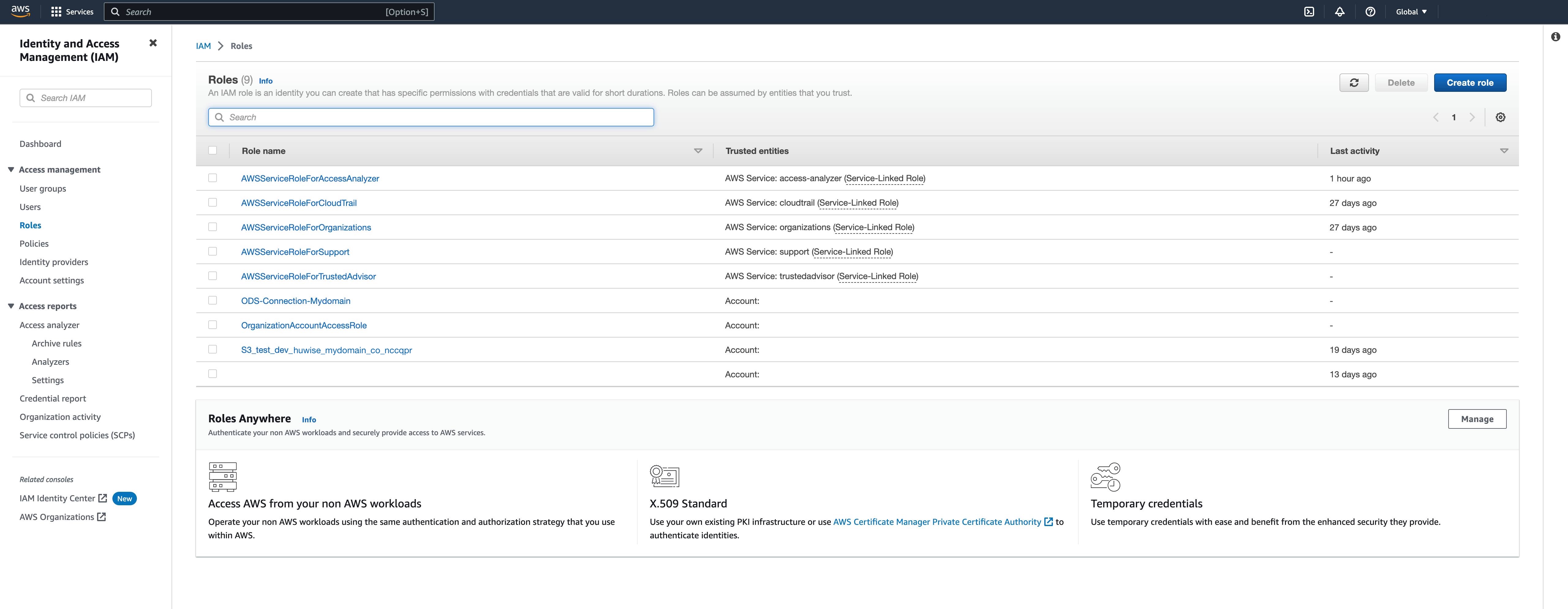 Vous trouverez l'ARN du rôle au centre de l'écran. Il doit contenir votre numéro de compte AWS et le nom de votre rôle (par exemple, arn:aws:iam::061258320951:role/ODSRoleAuthMyDomain).