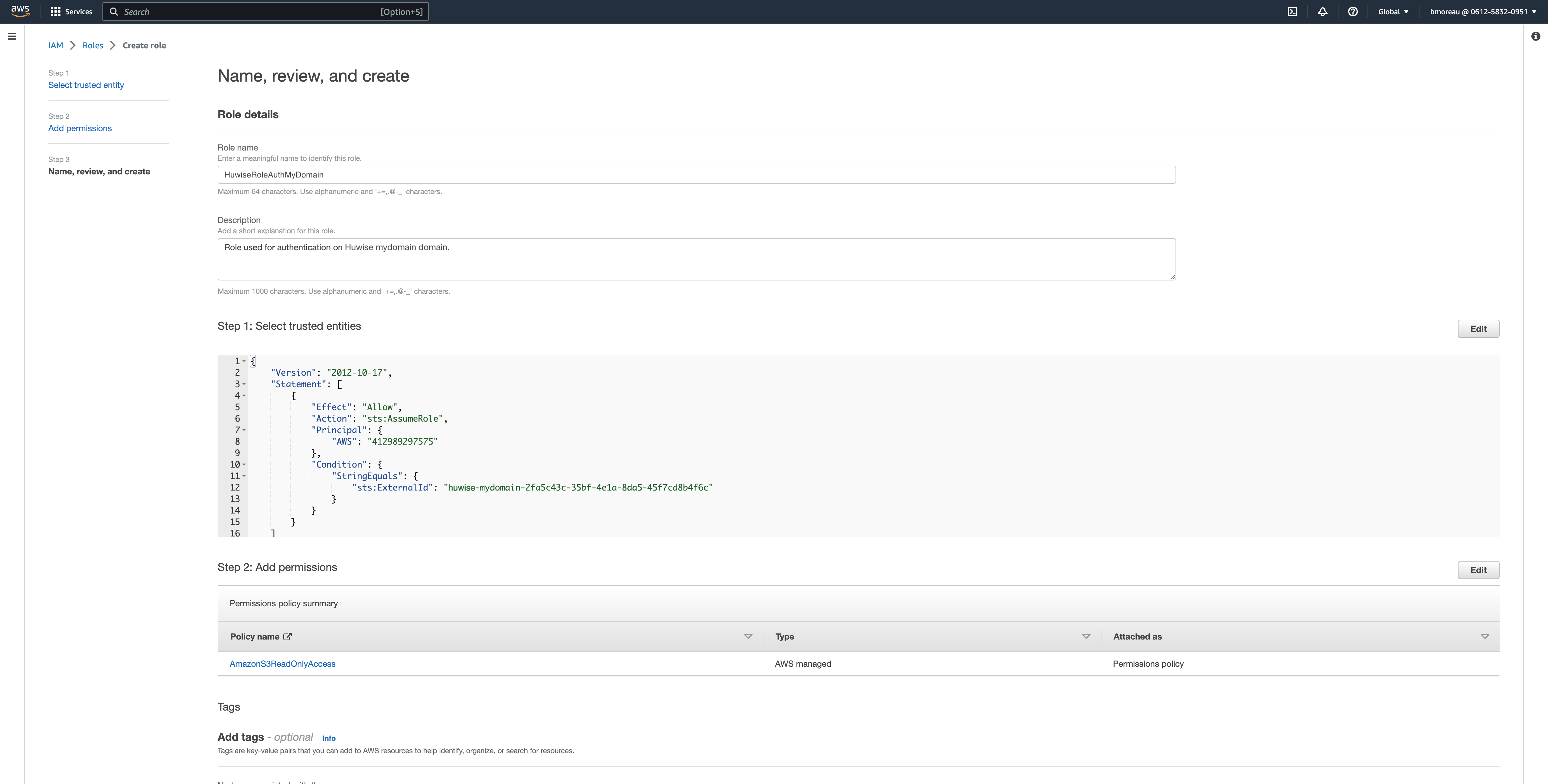 Nous allons maintenant créer le rôle qui autorisera le compte AWS externe Huwise de votre connexion à accéder à votre bucket.