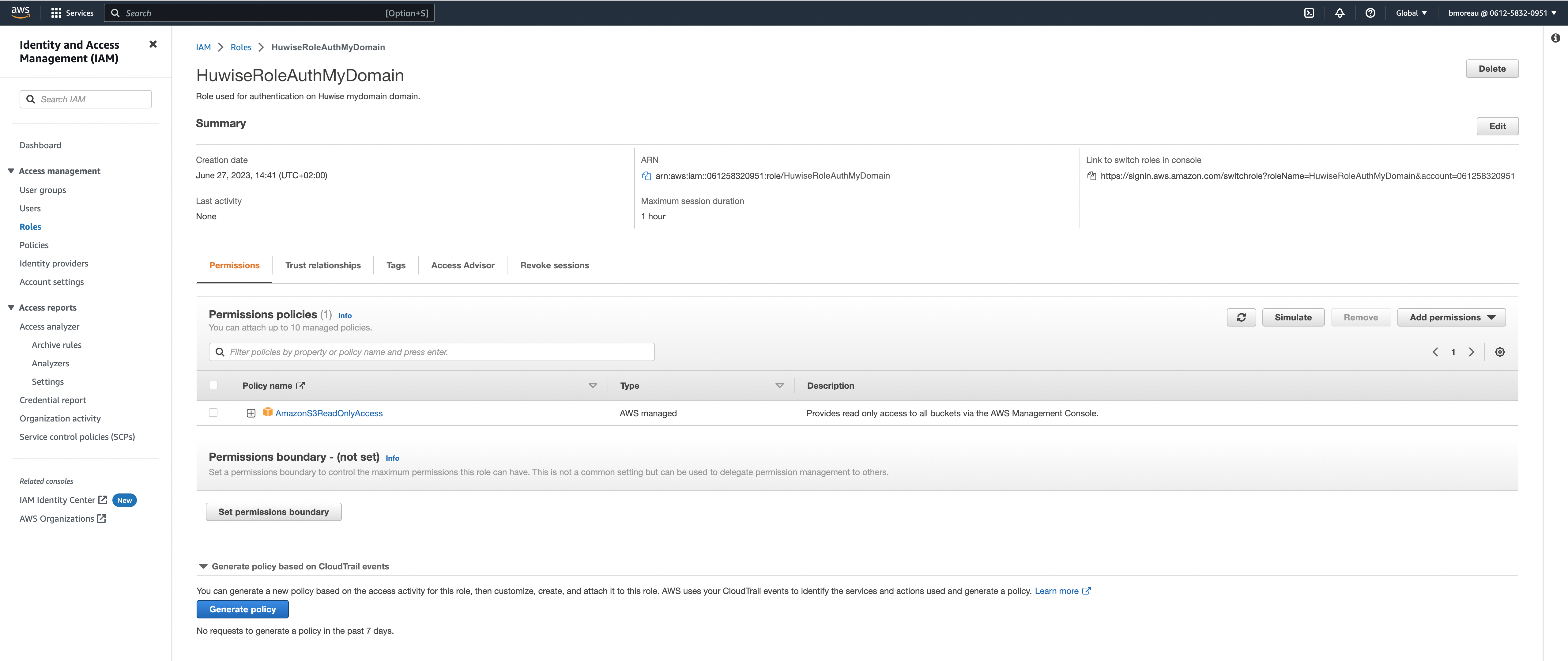 Si l'API renvoie l'erreur suivante Huwise AWS account is not authorized to assume the role identified by role_arn, vérifiez que l'ARN du rôle est le bon et que le rôle est bien configuré.