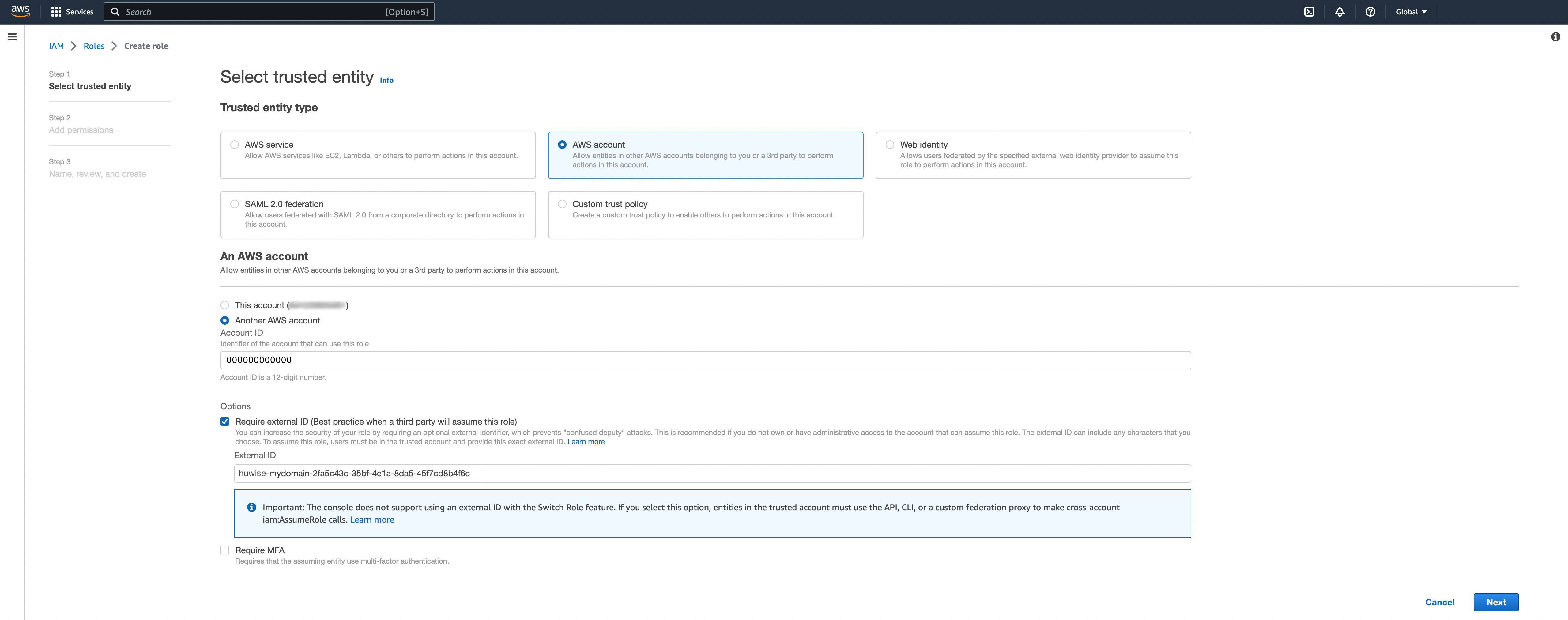 Comme dans ce qui suit, sélectionnez l'entité de confiance « Compte AWS ». Sélectionnez ensuite « un autre compte AWS » et remplissez le champ « ID de compte » avec le "huwise_aws_account_id" renvoyé dans la connexion nouvellement créée.