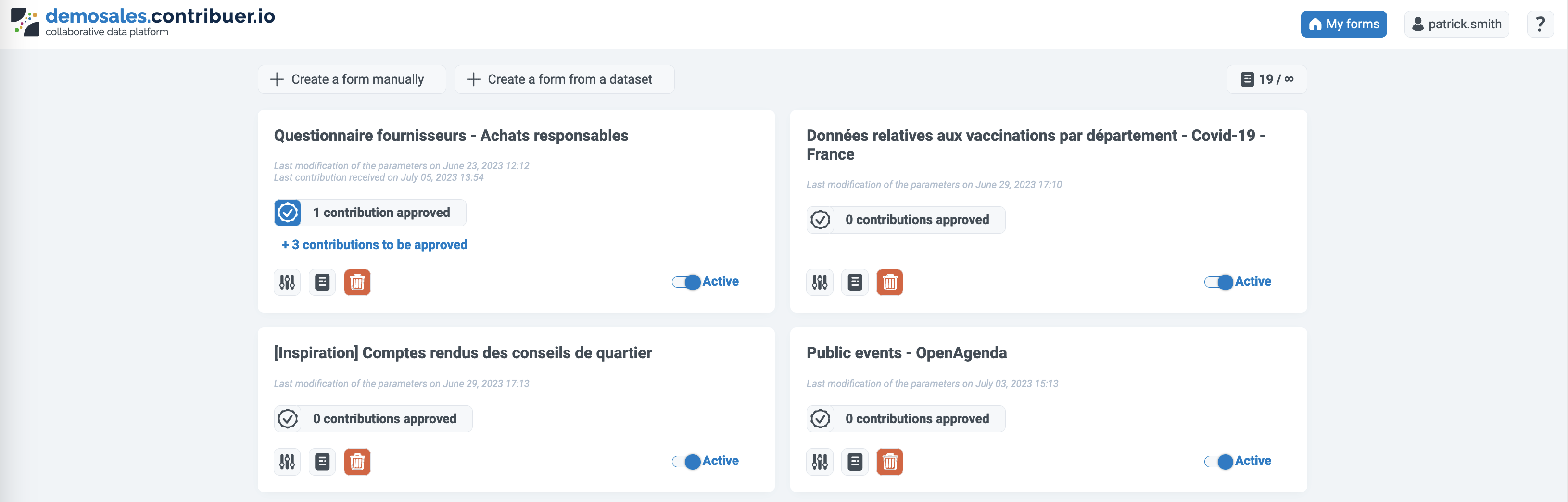 Once you've signed up for the feature, you will be given a contribuer.io space. To create and manage your forms, go there and sign in with your Huwise credentials (your contribuer.io site will be https://<your_domain>.contribuer.io).