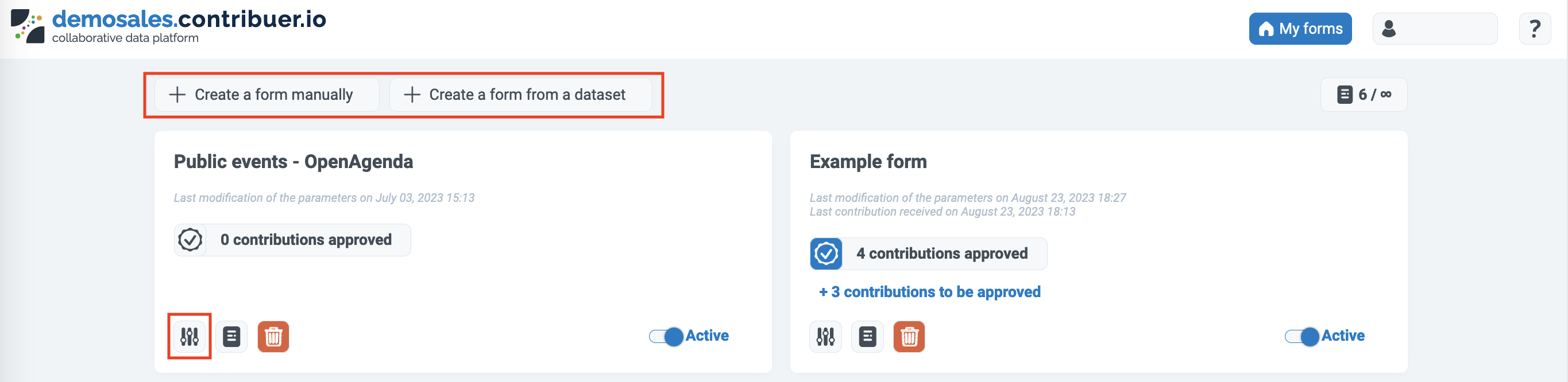 On your contribuer.io account, click on the settings icon for the form you've created.