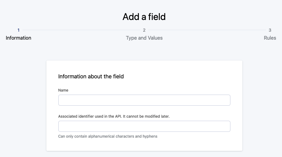 Like for the template itself, the identifier is created automatically, but can be modified if necessary. Note however that once you have created the field, the identifier can no longer be modified.