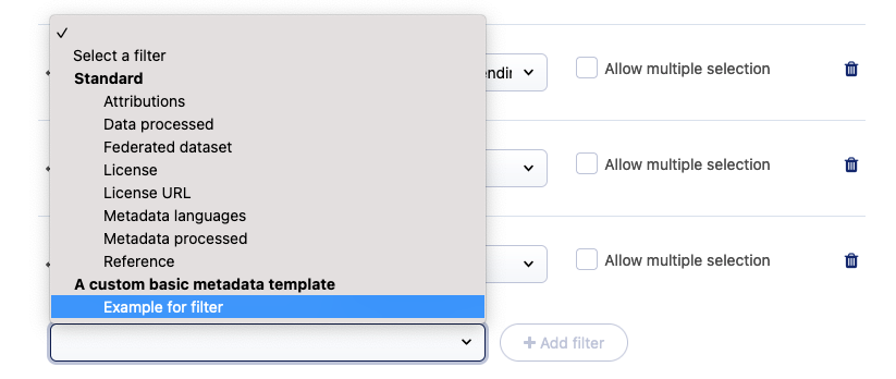This option allows you to add this field to the filters for your catalog and in the Explore API. Having enabled this option for a given field, you can then go to Configuration > Catalog and dataset pages > Catalog page — filters, where that field will now be an option. Select that field and apply it as a filter.