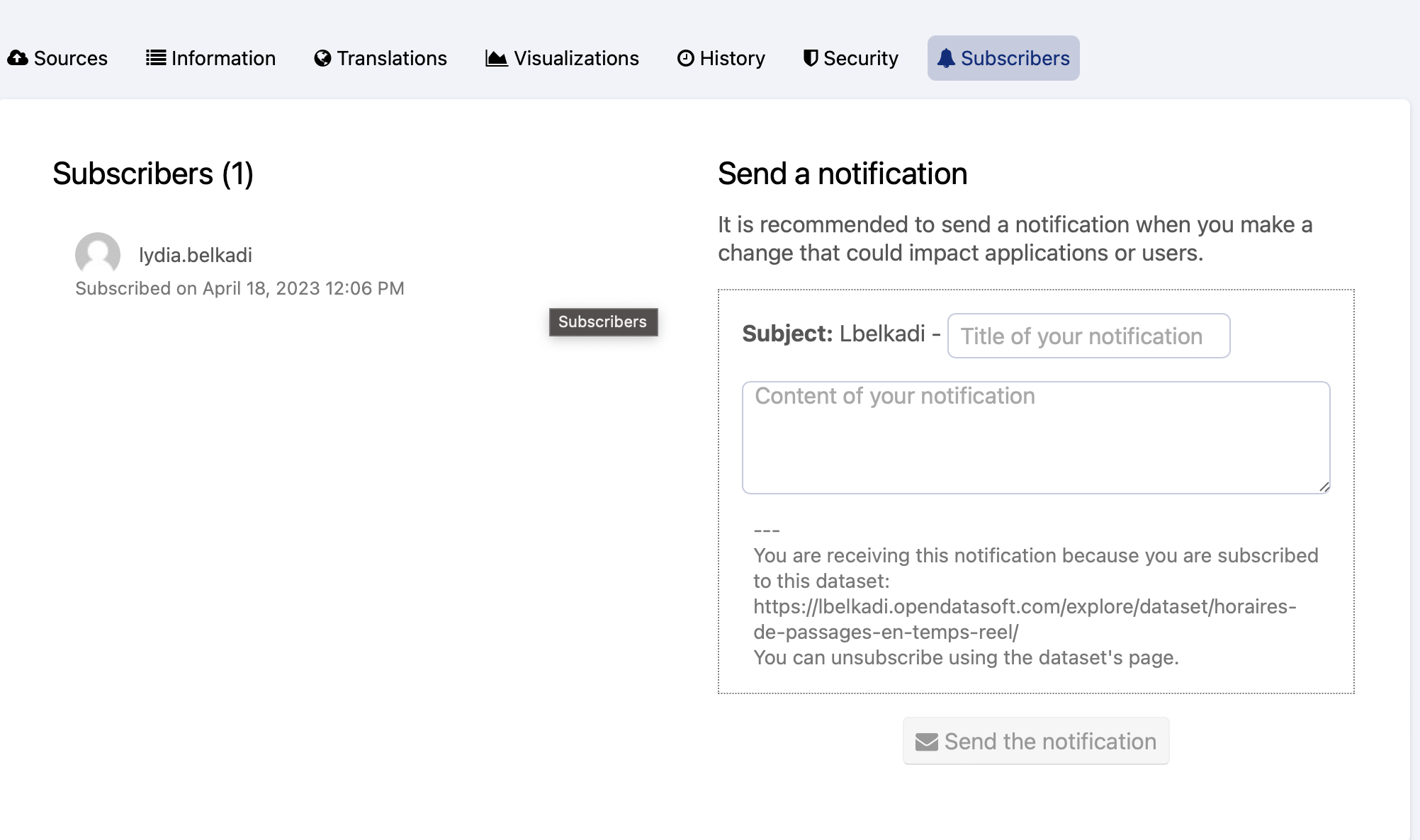 Write your message then click on the Send the notification button. Your message can be about a future depreciation, a change in the data scheme, ...