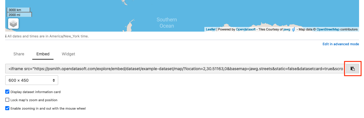 Data visualizations can either be embedded via an iframe or as a widget. Both are pieces of code that allow anyone to integrate an element directly on a webpage.