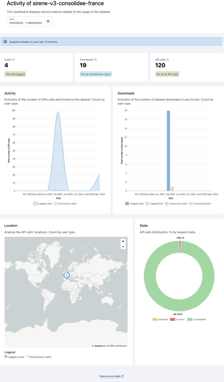 ). The percentage represents the part of the downloads made anonymously.API calls: The total number of API calls performed on the dataset. The percentage represents the proportion of dataset usage compared to your total number of API calls during the selected period.
