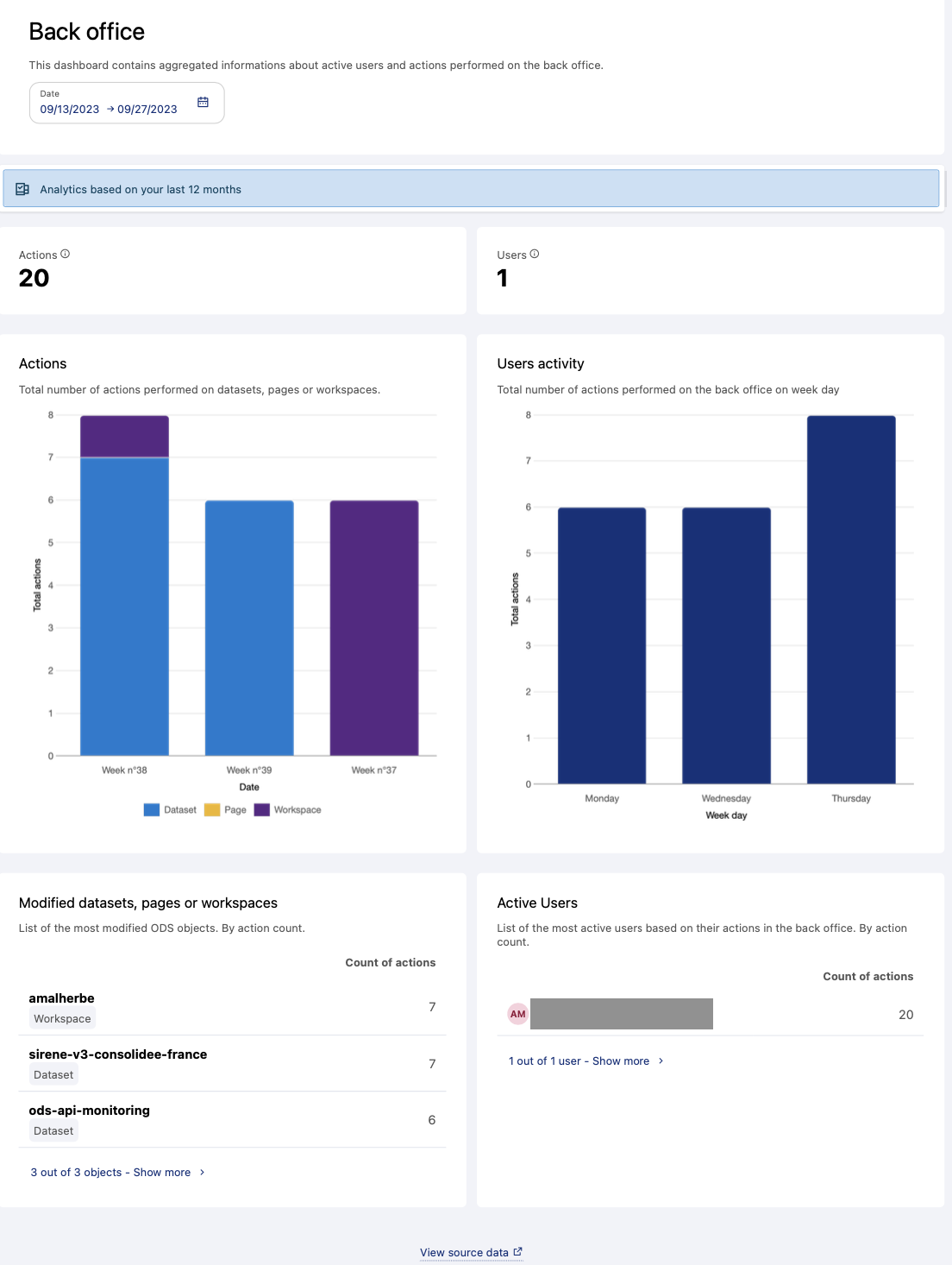 Actions: This chart shows the total number of actions executed in your workspace's back office, grouped by object type (datasets, workspaces, and pages).