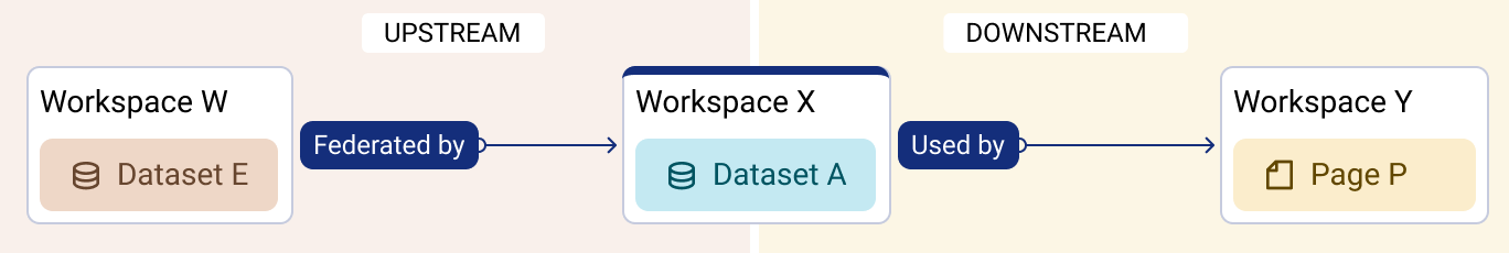 In the example below, Dataset E is upstream from Dataset A. Page P is downstream from Dataset A.