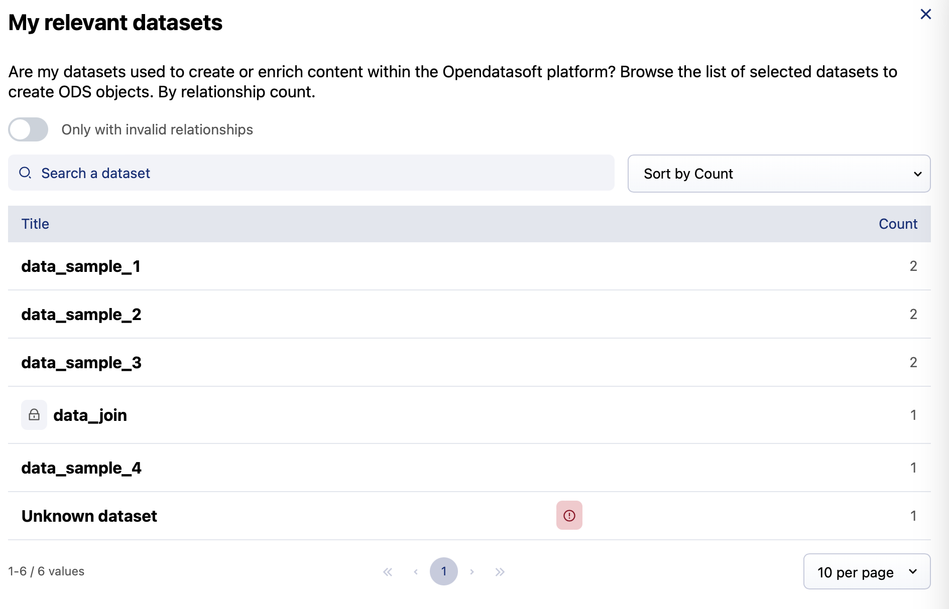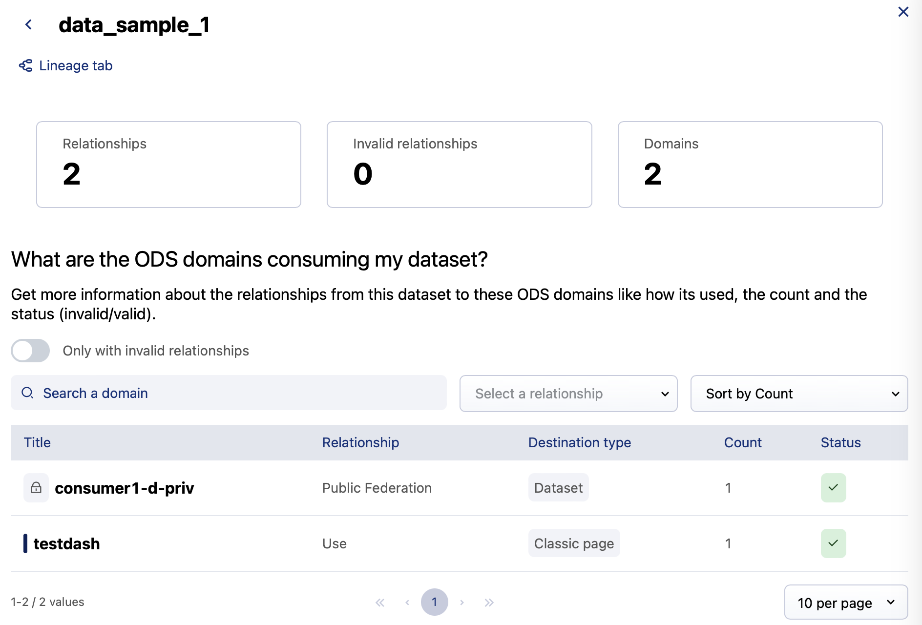 Invalid relationships: This KPI measures the number of direct relationships that are identified as invalid with your datasets as the origin.