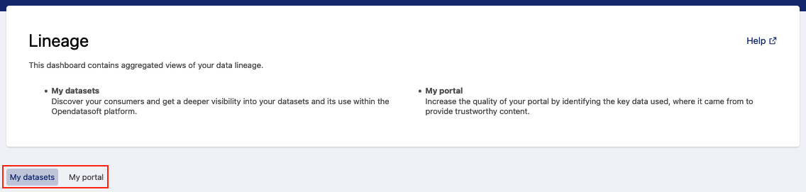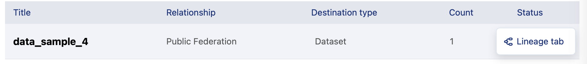 For each published dataset of your portal, you can go straight to its lineage tab. Hover over the dataset, and a Lineage tab button will appear (see below). See here to learn more about using the lineage feature for an individual dataset.