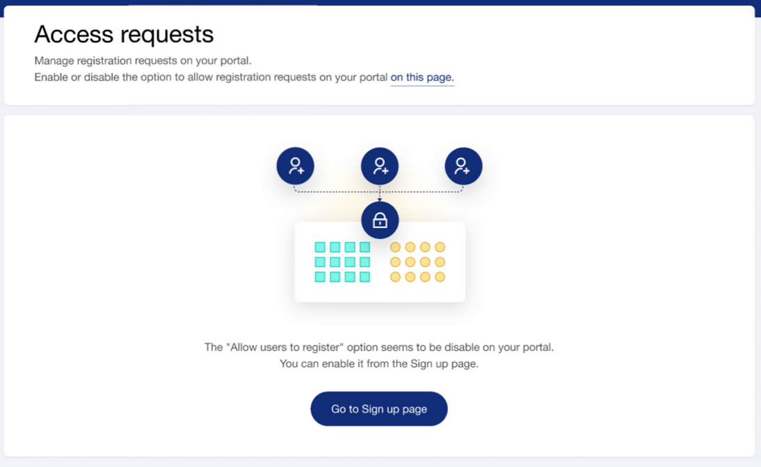 Note that if signing up is disabled on your portal, the Access requests page will propose a link to open the Configuration > Signup page, where you can enable that setting under "How do you want to manage your users?"
