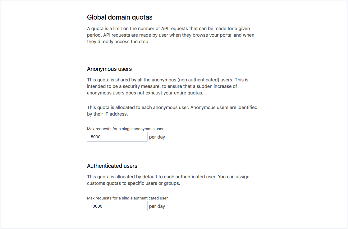 By default, every portal has overall quota limits. But you can set up more specific limits, for example to keep individual users from using your plan's entire quota by themselves. Huwise allows you to set generic per-user limits for both authenticated and anonymous users, as well as an overall limit for all anonymous users.