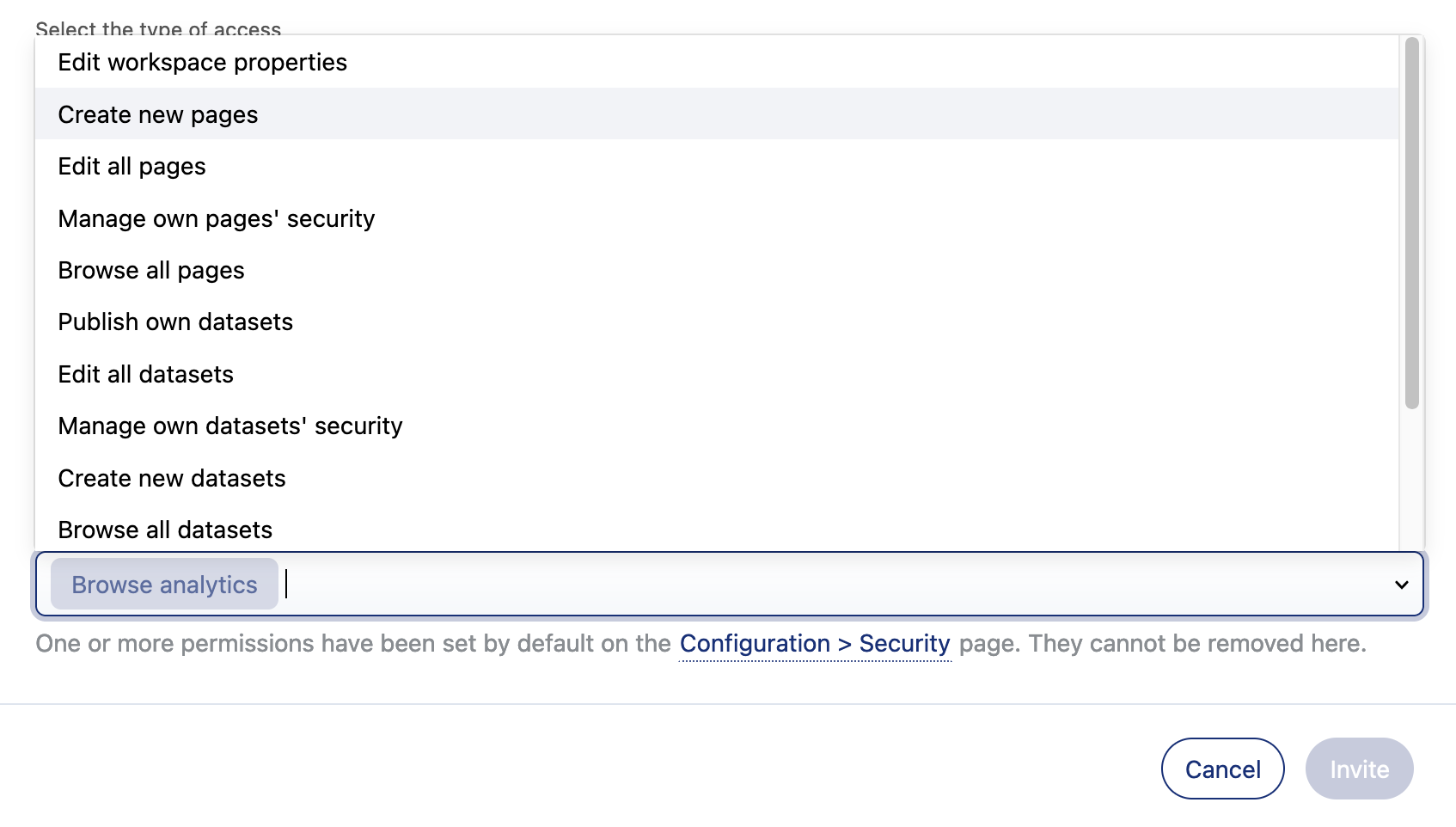 In the example below, the permission "Browse analytics" has been added as a default. In a new invitation, it is automatically selected. You can add any further permission you like, but to remove "Browse analytics" you must return to the "New users' default permissions' section and remove it there before making the invitation.