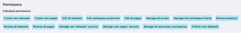 Manage all secondary workspaces | This permission grants access to the Workspaces section of the back office. If workspaces are enabled on your portal, the user with this permission may create, edit, and delete them. For example, they can create secondary workspaces, and distribute pages, datasets, and quotas from the main workspace to them. |