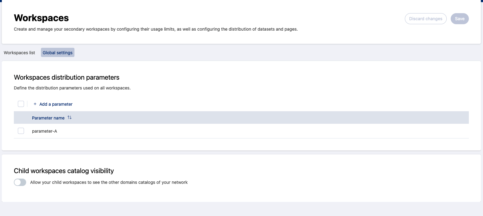 First, we'll add two parameters for all our secondary workspaces. On the Workspaces page, click on the Global settings tab.
