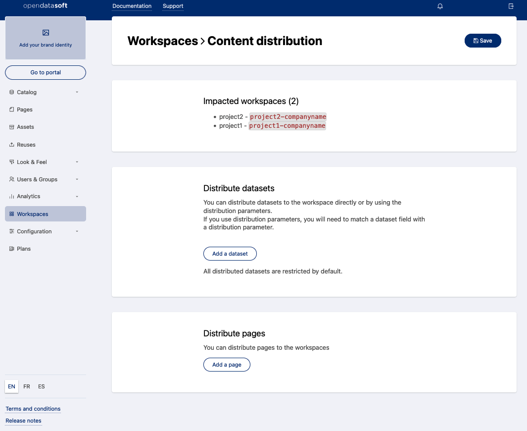 To distribute datasets or pages to several workspaces, you should, from the workspaces list: