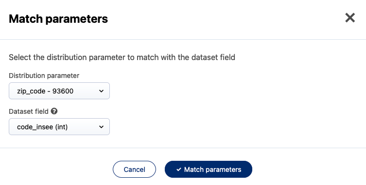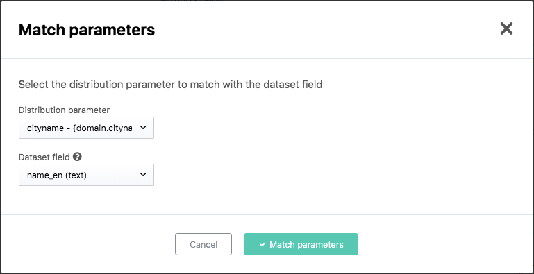 To distribute the dataset, we add it to the list and then click Match parameters. This allows you to configure a filter on the data that relates to a distribution parameters. In our example, our dataset has a
