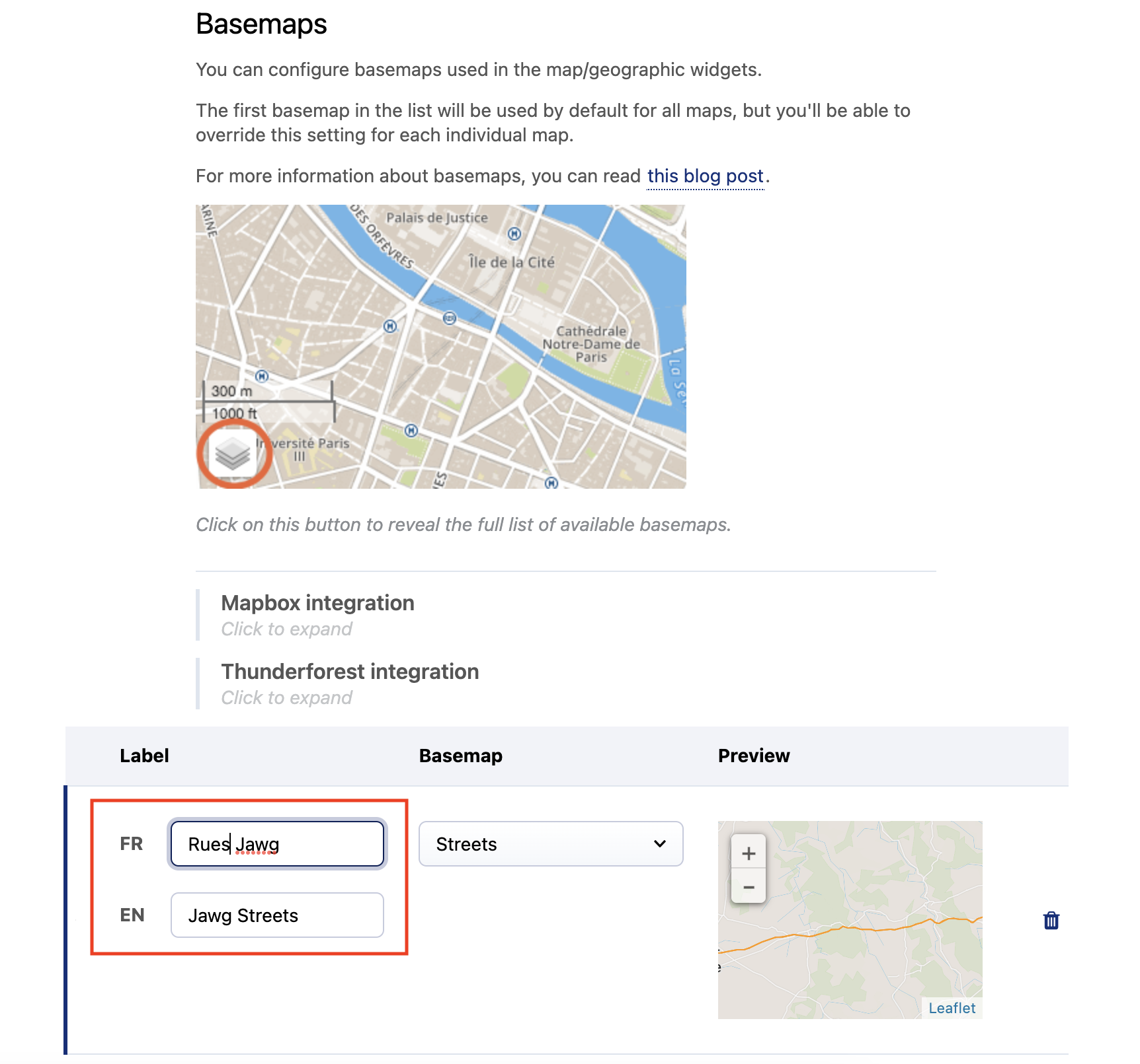 You can customize the labels you use in your basemaps. To do so, go to Look & Feel > Data visualization. Find the labels listed under "Basemaps," and enter the appropriate labels in each language: