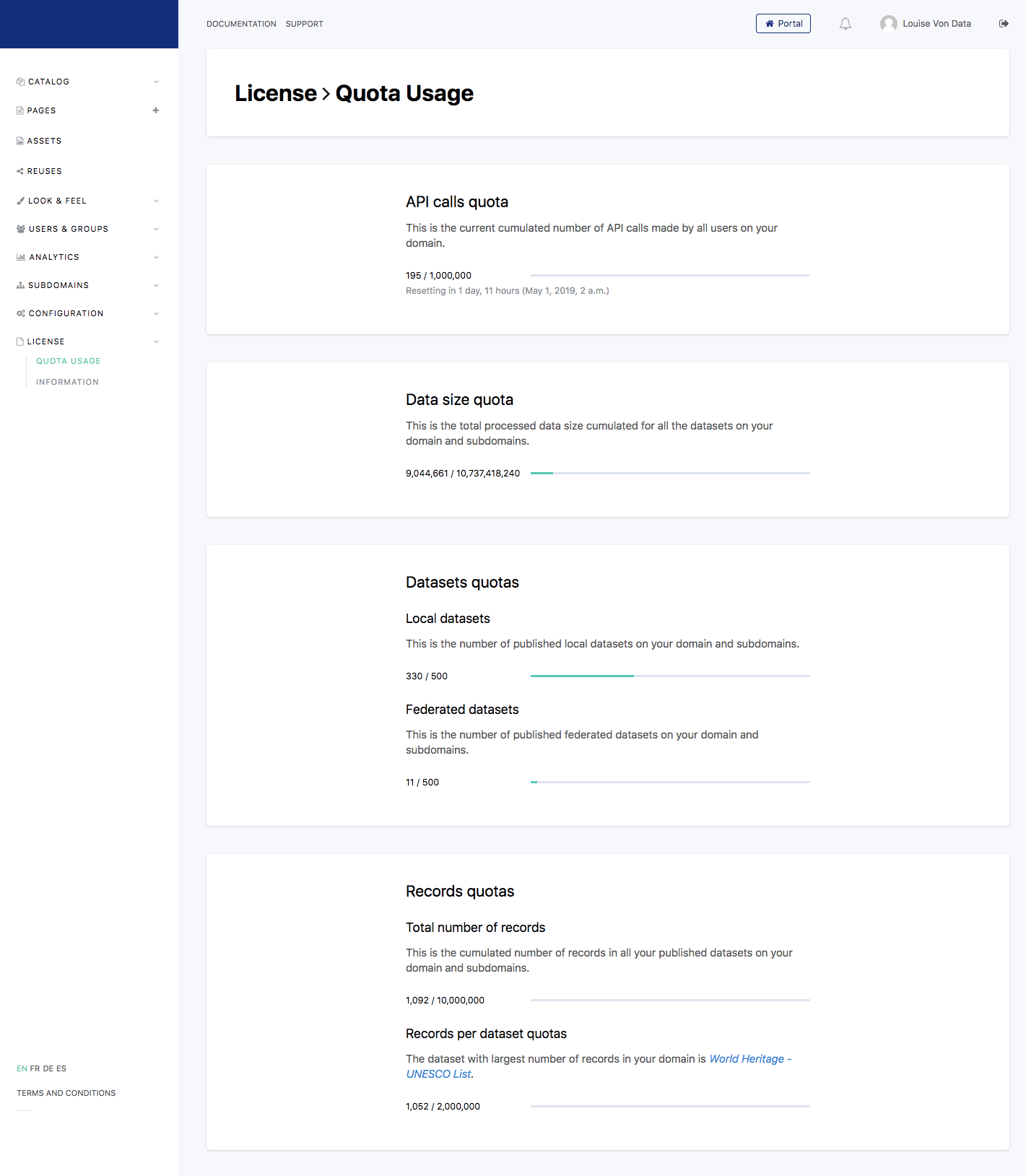 You will find three usage indicators comparing the number of datasets, the number of records, and the number of API calls to the quotas defined in your license.