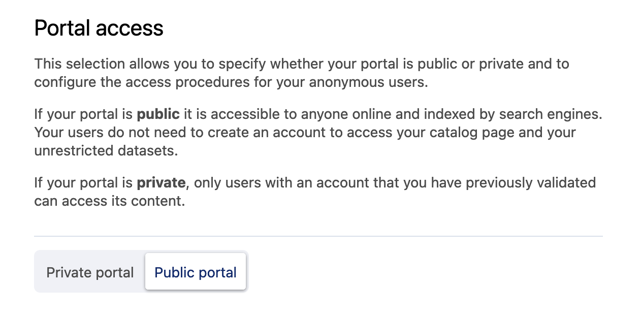 If a portal is public, users do not have to sign in to Huwise. Anyone online can visit your portal, which is indexed by search engines. Your catalog and any unrestricted datasets are visible to the general public.