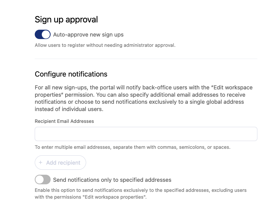 If you allow people to register, you'll then have to decide whether you want to approve each access request to your portal manually or not. Note that whatever your decision, each member of the portal able to manage users will receive a notification for each new access request.