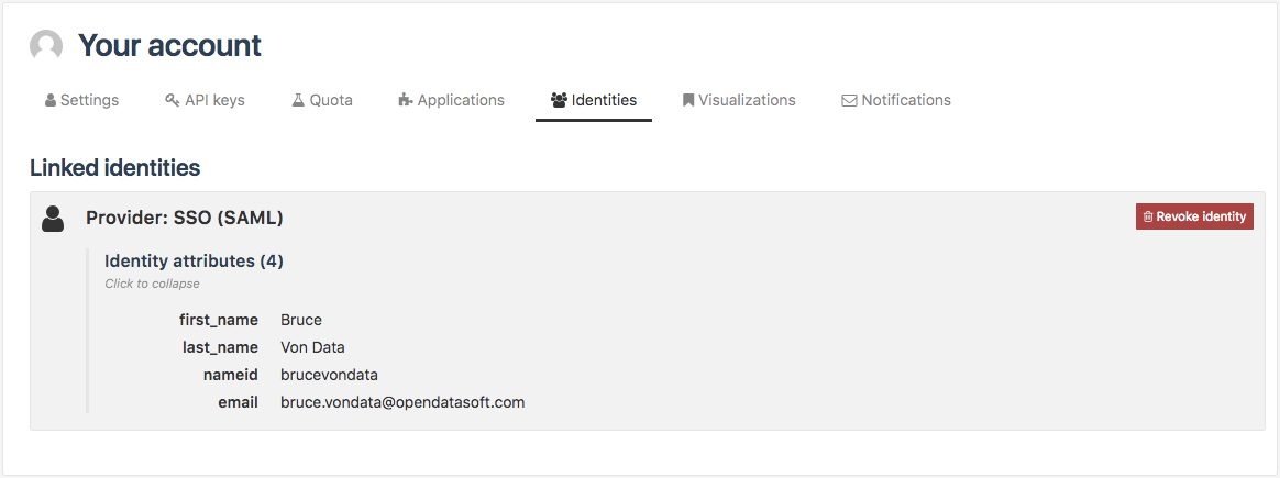 Users who have been logged in through identity federation (SAML 2.0 or OpenID Connect) may have been set specific profile attributes. These attributes can be used to filter the content of the datasets these users can access.