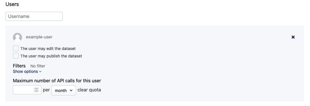 Once they're added, you can select if they are permitted to edit and publish the dataset, and you can limit the number of API calls this user is allowed to perform.