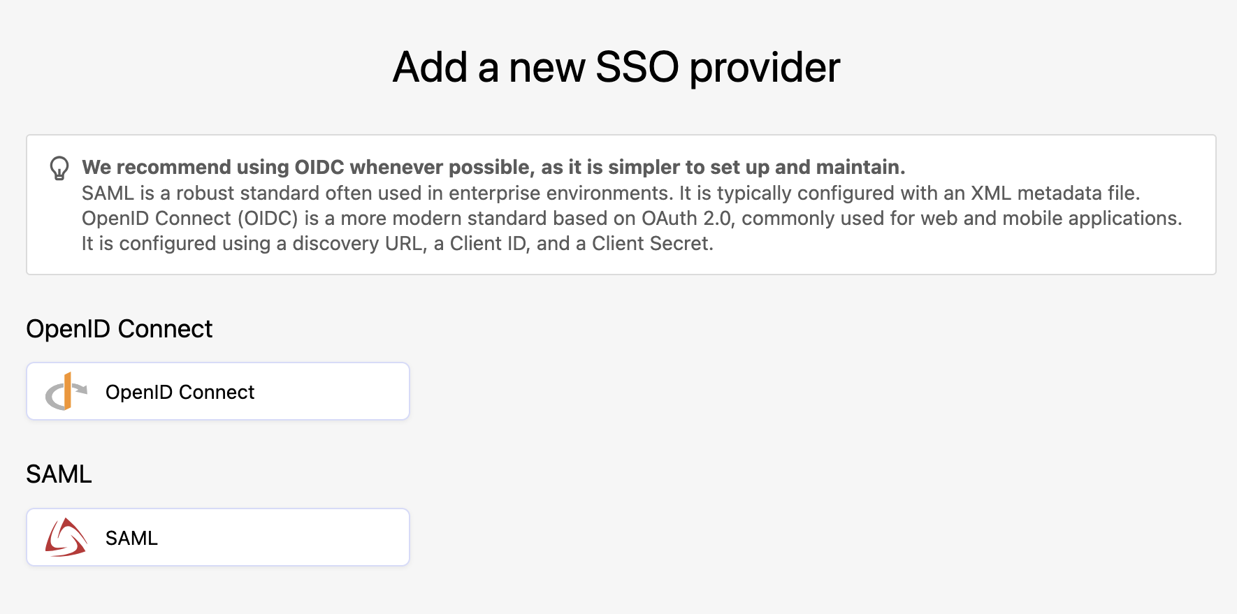 In the back office, under Access > SSO, click on Add a provider in the upper right-hand corner, then click on the OpenID Connect button.