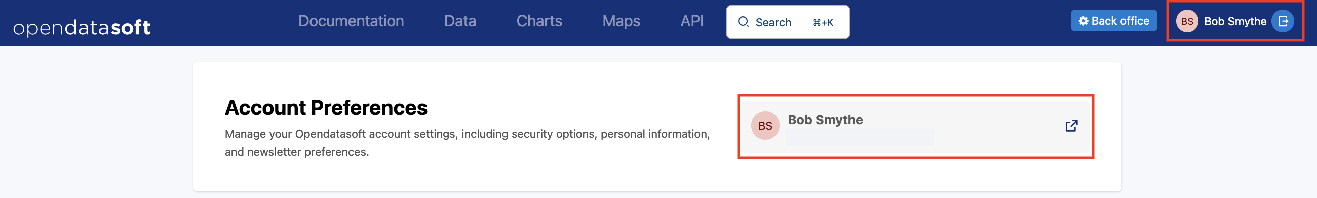 To modify your account settings, click into your account in the upper right corner (next to the log out button). There, click on the box with your name and email account to the right of "Your Huwise profile." Log in, if necessary.