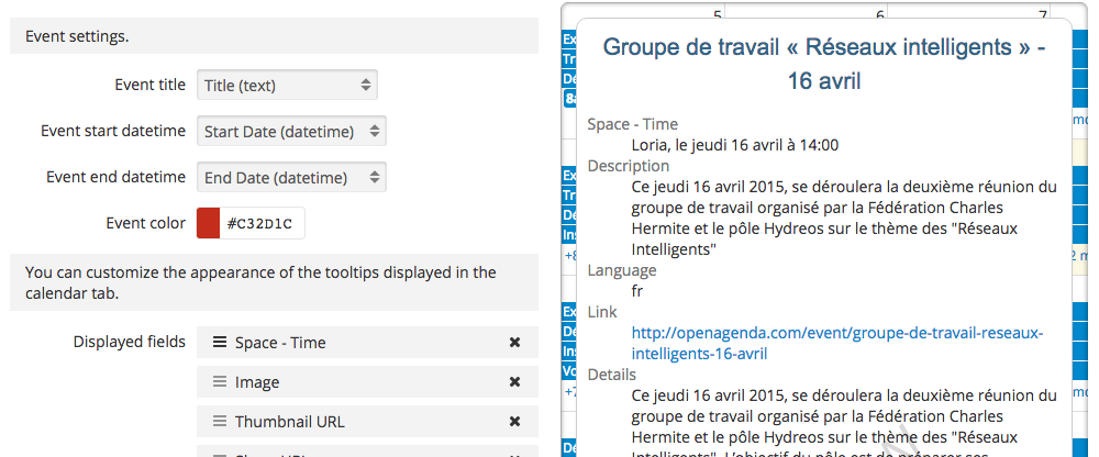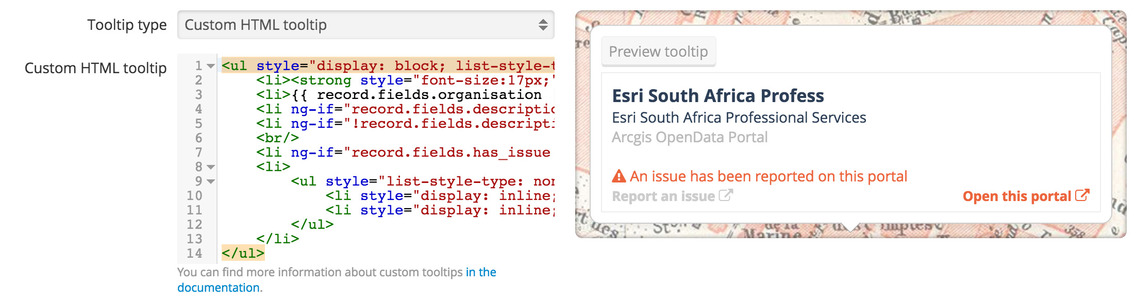In order to display information on a map, on an image, or in a calendar, you can configure a tooltip. You can use and configure the standard tooltip or customize it more precisely using a custom HTML tooltip. A custom tooltip is slightly more time consuming, but it is a good way to leverage your data. To switch from the standard tooltip configuration interface to this custom tooltip view, select "Custom HTML template" from the tooltip type dropdown menu.