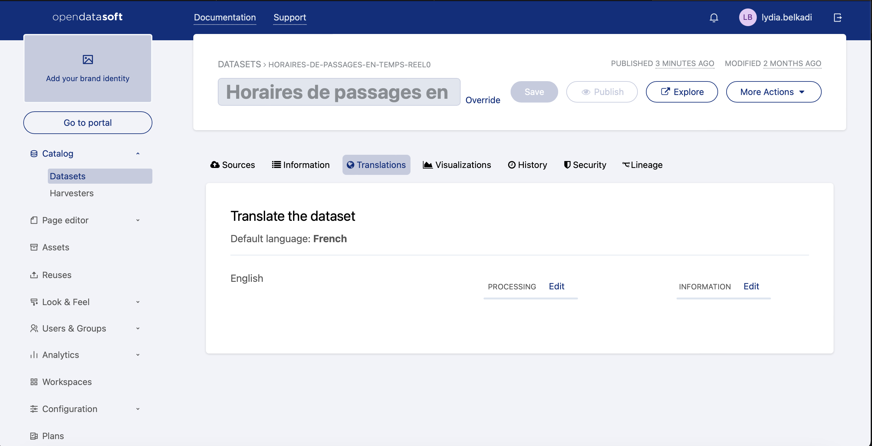 If an element is not translated, it will appear in the portal in its original value, whichever language is selected by the user.If an original element is modified after it has been translated, a notification will be displayed in the Translations tab, as well as in the translation interface. In the latter case, you can choose to keep the current translation or modify it. Until this has been done, the original non-translated value will be displayed in the published dataset.