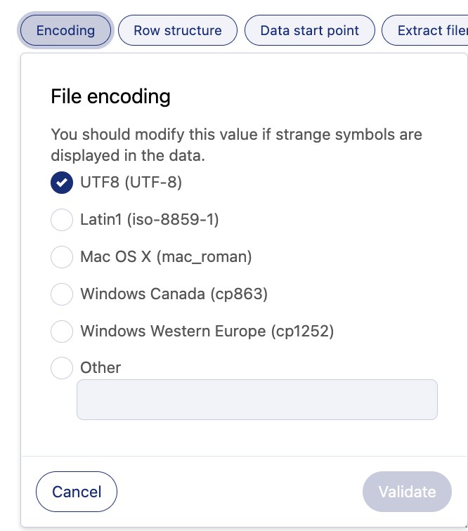 Character encoding is the way characters are represented in a file. UTF-8 is the universal standard, but some files might be encoded in a legacy format (for example, old versions of Excel), which would require setting the encoding manually.