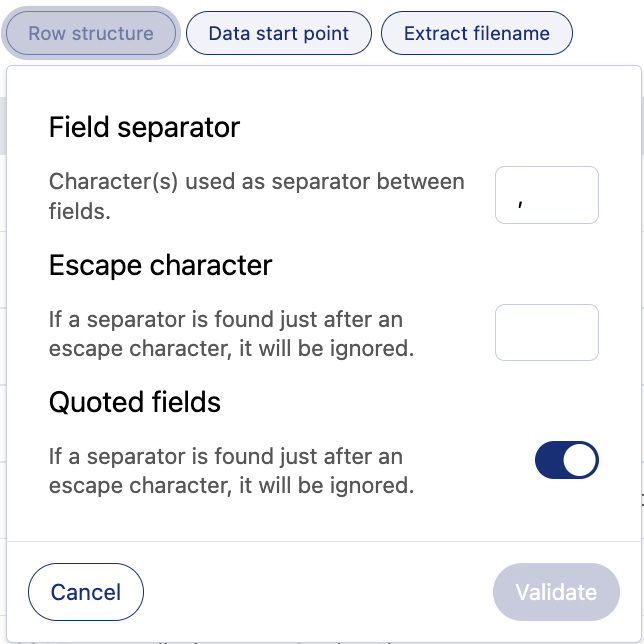 Quoted fields refers to fields which values are enclosed in double quotes. By default, this option is toggled on. Toggle off the option if the field values are not enclosed in double quotes.