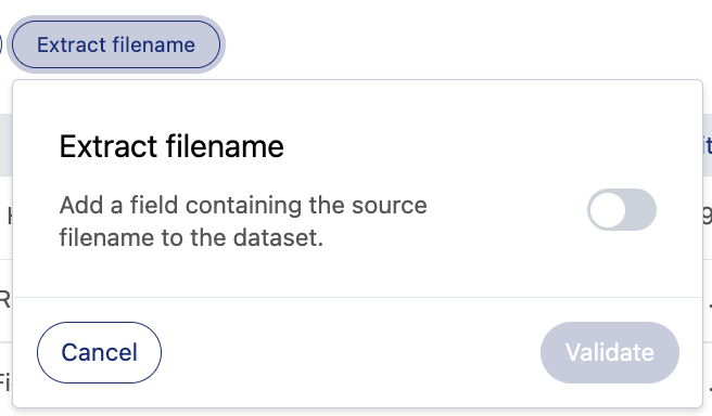 By toggling on the Extract filename option, you will add a new column to your dataset that will contain the name of your source file. This can be extremely useful if your dataset contains several sources, for instance, with sources containing dates.