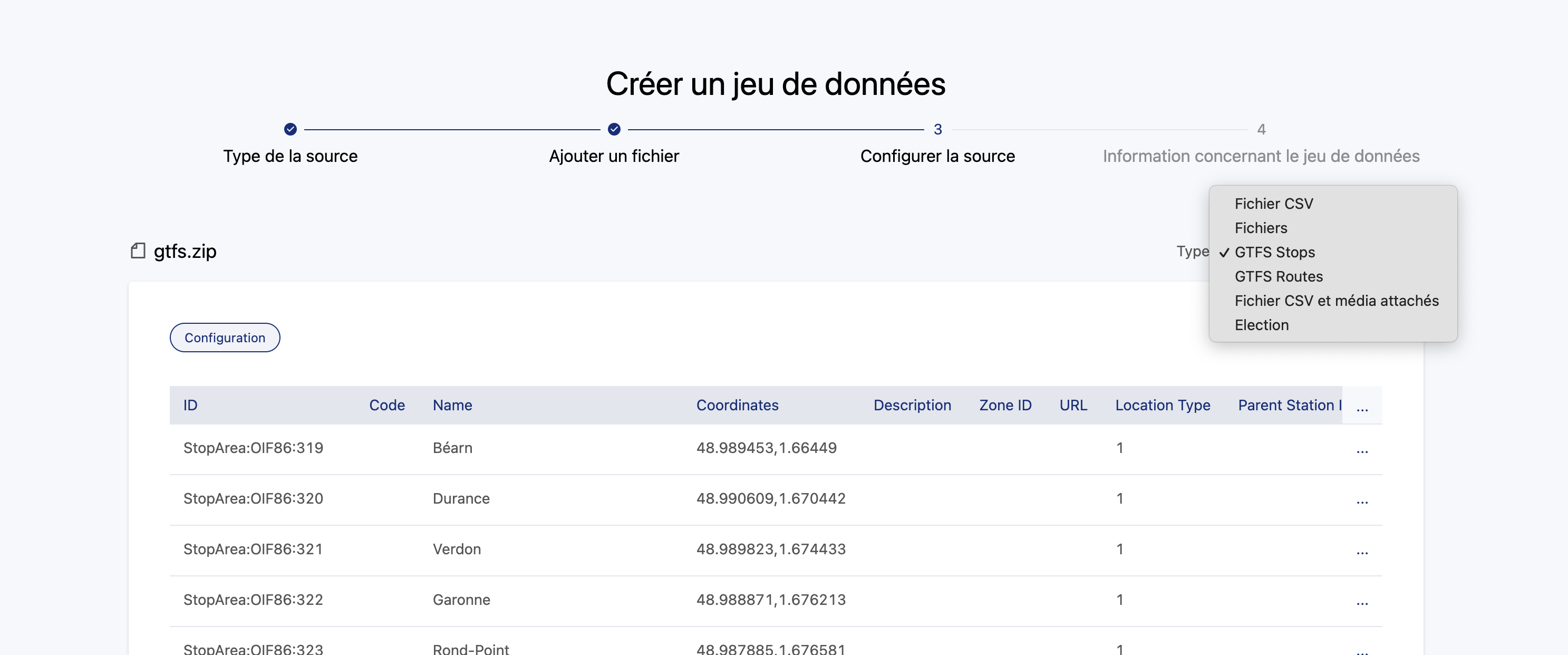 You won't see any change in the interface, though when importing a GTFS (.zip), but the data will be recognized and the connector selected by default. You can select for either stops or routes, as seen in the example below: