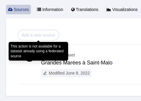 Some actions, like adding sources or processors, are not available for a dataset that uses a federated resource, for example a dataset from the Huwise Data Hub. These actions are either disabled in the back office, as in the grayed-out Add a new source button shown below, or simply do not appear, as with the Processing tab.