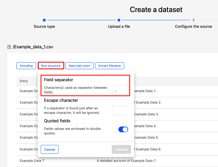 Header | For files whose first line contains field names | By default, this option is toggled on. It makes the values of the first line field labels. Toggle off this option if the first line doesn't contain field names but data: the field labels will then be empty by default. |