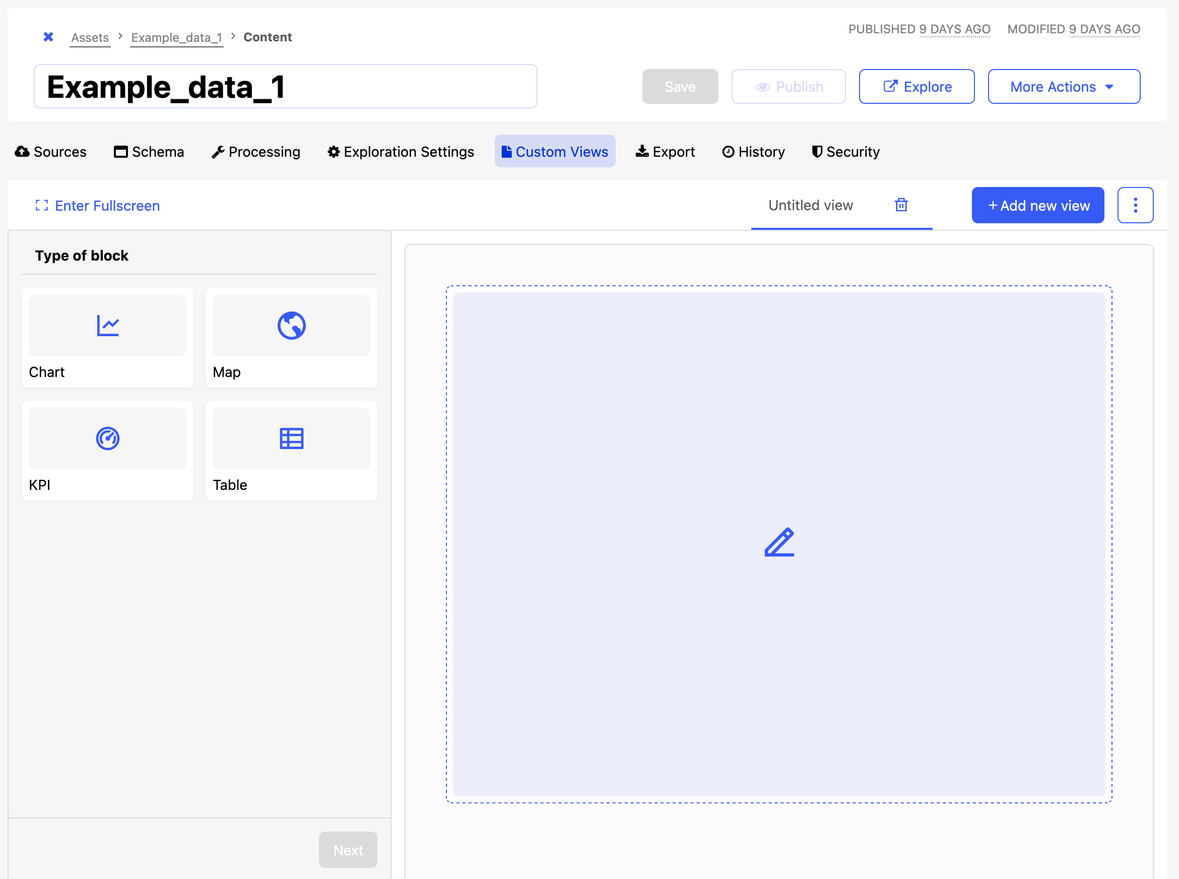 To create a custom view for a dataset, click Edit content in the dataset, then click on the Custom Views tab.