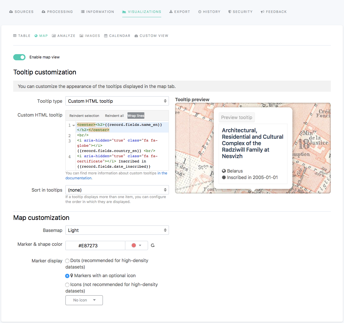 The Tooltip customization section contains a variety of options to customize the tooltips that can be displayed on the map visualization of a dataset. A tooltip is a box that appears when clicking on an element of the map that represents data, for example a map marker or a geographical shape. The tooltip displays information about its related data.