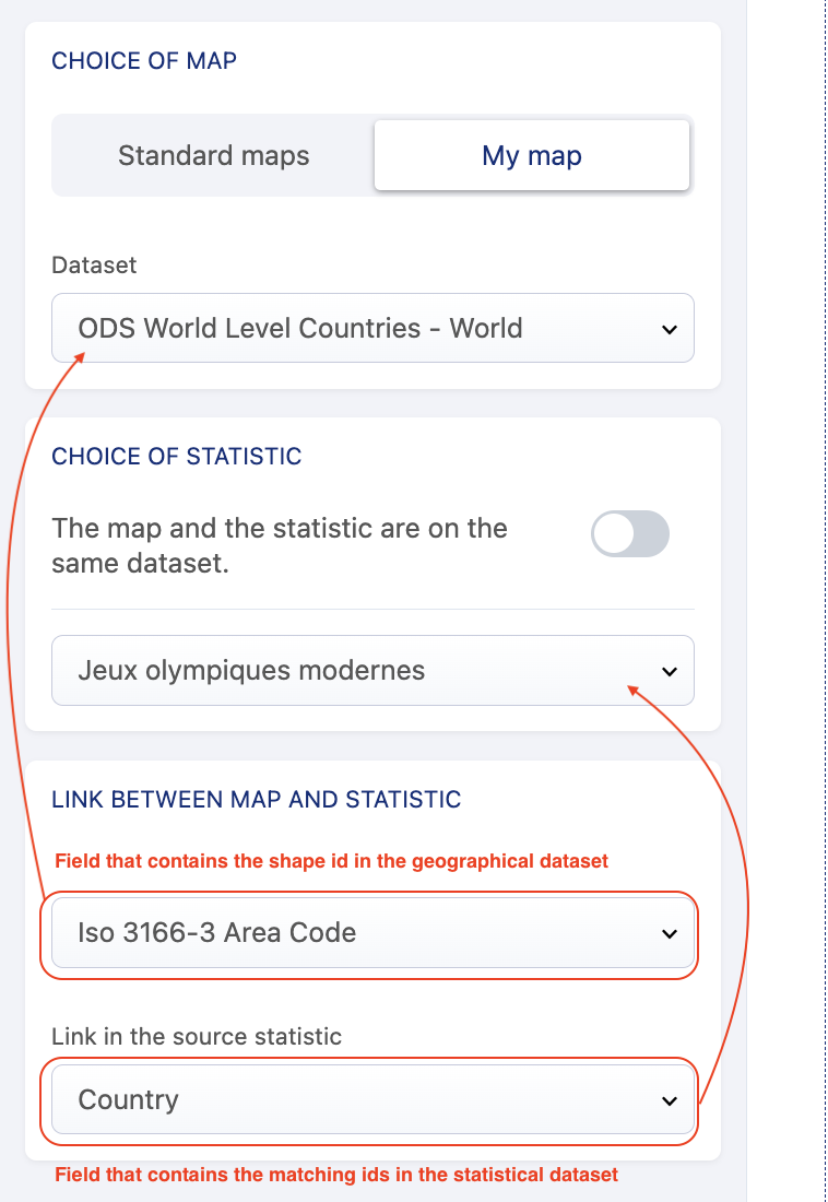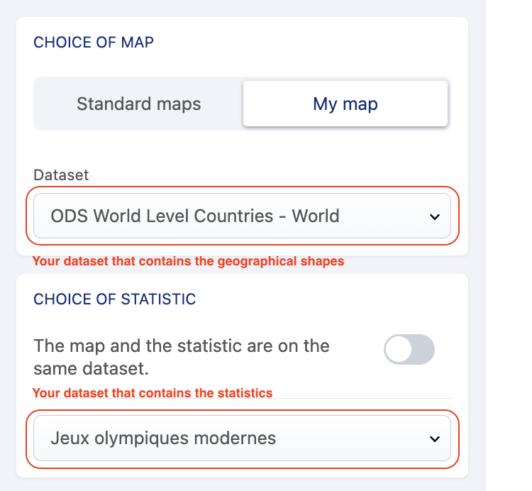 Under "Choice of map" you can select the "Dataset" you wish to use. When you click on Select a dataset, you're shown all of the datasets on your portail that contain geographic shapes. Once you choose one, the preview shows the shapes found in that dataset.