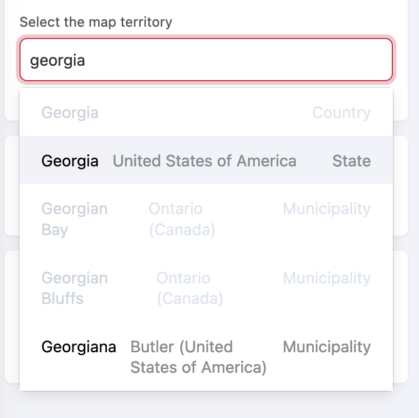 Note that only levels with subdivisions can be selected. In the image above, note how the country Georgia is grayed-out. To display a map of Georgia or any other country for which there are no lower subdivisions, you can use the "World" map. So, for the lowest administrative levels available, you should use a higher administrative level with the appropriate breakdown, or else use the My map option as described below.