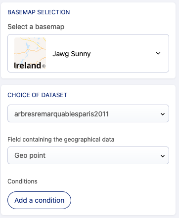 Select a basemap from those configured in the back office. To edit available basemaps, see Configuring data visualizations.