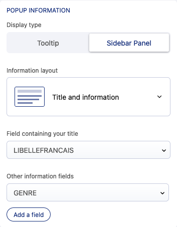 Select the type of popup : Tooltip (above the marker) or Sidebar panel (top left of the map).