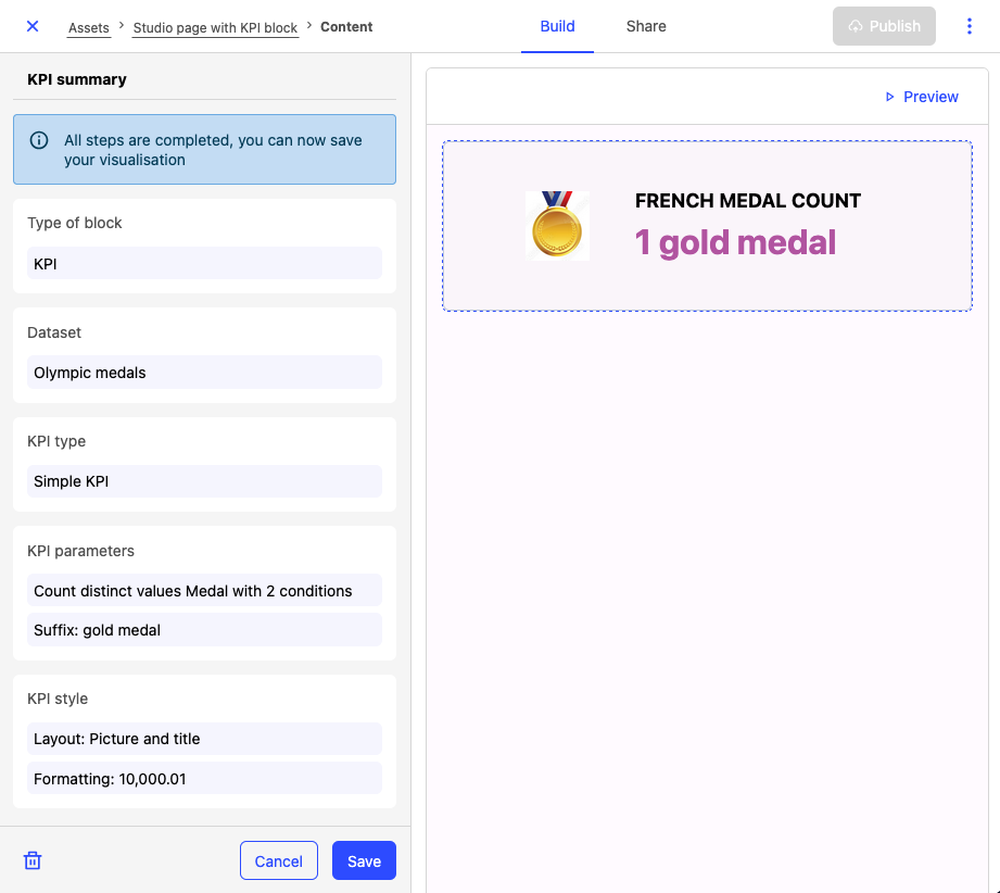 Note that you can see your KPI appears in the preview pane. Once you completed the block configuration, you can click the block again in the preview pane to check and edit the KPI parameters in the side pane.
