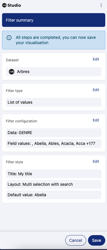 As an example, let's imagine we add a title, "My title," and a default value, "Abelia." You can see that on the right side, the filter is pre-filled with the chosen value, and the title appears at the top: