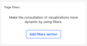 Once you have added at least one visualization to your page, the filters editor will show up in the left column. There you can add a filters section on the page by clicking on Add filters section.