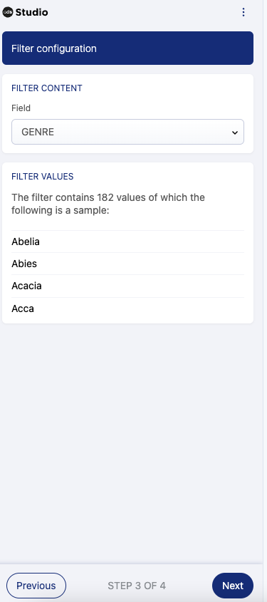 Here we will use the field "GENRE." After selecting it, a preview of some of the values will be displayed to make sure that this field will be the proper filter for your page: