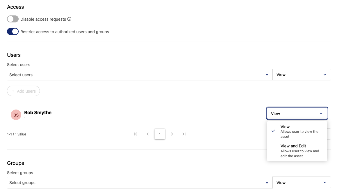 You can also restrict access to specific users and groups. Note that when you do so, you can provide them with either view or view and edit rights.