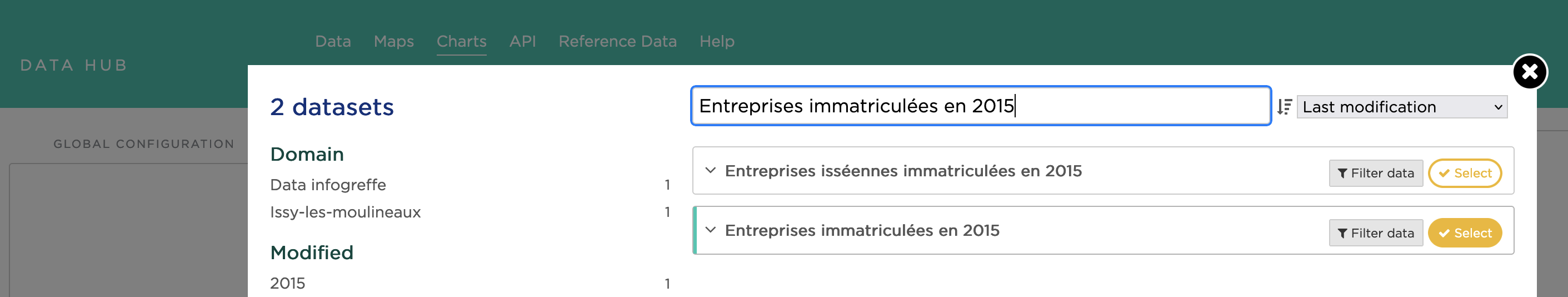 As an example, let's take the public dataset "Entreprises immatriculées en 2015" from the Data Infogreffe domain. You could click Filter data to refine the data, but in our case let's select the dataset.